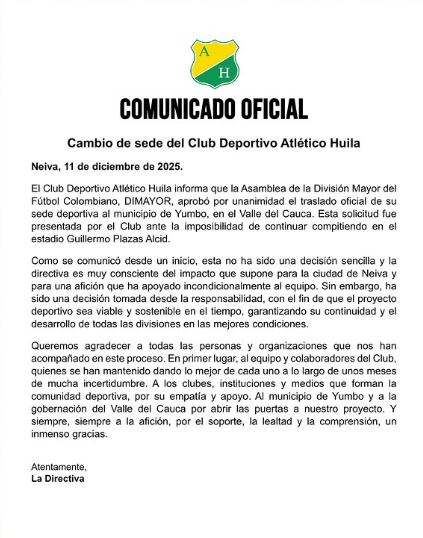 La Asamblea de la Dimayor aprobó la solicitud presentada por Atlético Huila para cambiar su sede deportiva a partir del año 2026, decisión con la que el club buscará el ascenso a la primera división del fútbol profesional colombiano desde el Valle del Cauca. Con esta determinación se pone fin a una tradición de 34 años en los que el equipo disputó sus partidos como local en el estadio Plazas Alcid de Neiva, escenario histórico para la afición opita.