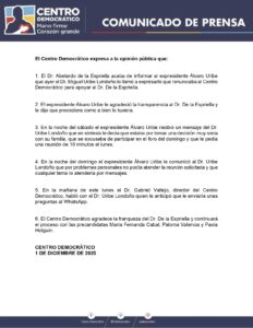 El Centro Democrático informó este domingo que Miguel Uribe Londoño ya no hace parte de la lista de precandidatos presidenciales del partido. A través de un comunicado, la colectividad explicó que Abelardo de la Espriella le notificó al expresidente Álvaro Uribe que, supuestamente, el senador Miguel Uribe Londoño lo había llamado para anunciar su renuncia al partido con el fin de respaldarlo. Según el mensaje divulgado, “El Dr. Abelardo de la Espriella acaba de informar al expresidente Álvaro Uribe que ayer el Dr. Miguel Uribe Londoño lo llamó a expresarle que renunciaba al Centro Democrático para apoyar al Dr. De la Espriella. El expresidente Álvaro Uribe le agradeció la transparencia al Dr. De la Espriella y le dijo que procediera como a bien lo tuviera”.