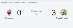 En el Grupo B, Real Cundinamarca dio el golpe al golear 3-0 a Patriotas en el estadio La Independencia. Jhon Cortés abrió el marcador al minuto 39, Arney Rocha amplió la cuenta en el 45+2’ y Jayder Asprilla sentenció el triunfo al 77’, sellando la histórica clasificación del equipo, que disputará su primera final en la categoría.