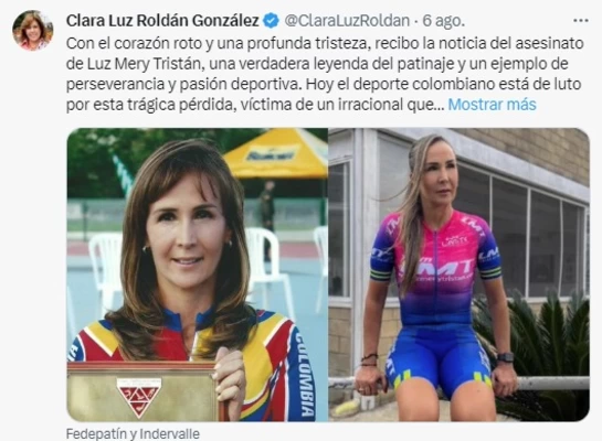 “Con el corazón roto y una profunda tristeza, recibo la noticia del asesinato de Luz Mery Tristán, una verdadera leyenda del patinaje y un ejemplo de perseverancia y pasión deportiva. Hoy el deporte colombiano está de luto por esta trágica pérdida”. Así reaccionó la gobernadora del Valle, Clara Luz Roldán, a la noticia del asesinato de este ícono del patinaje vallecaucano y nacional.