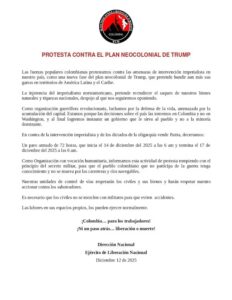 Según el ELN, la decisión se toma como protesta frente a lo que consideran posibles intervenciones de Estados Unidos en Colombia, América Latina y el Caribe. En el texto, el grupo señala que esta situación haría parte de un “plan neocolonial” que, a su juicio, amenaza la soberanía de los países de la región.
