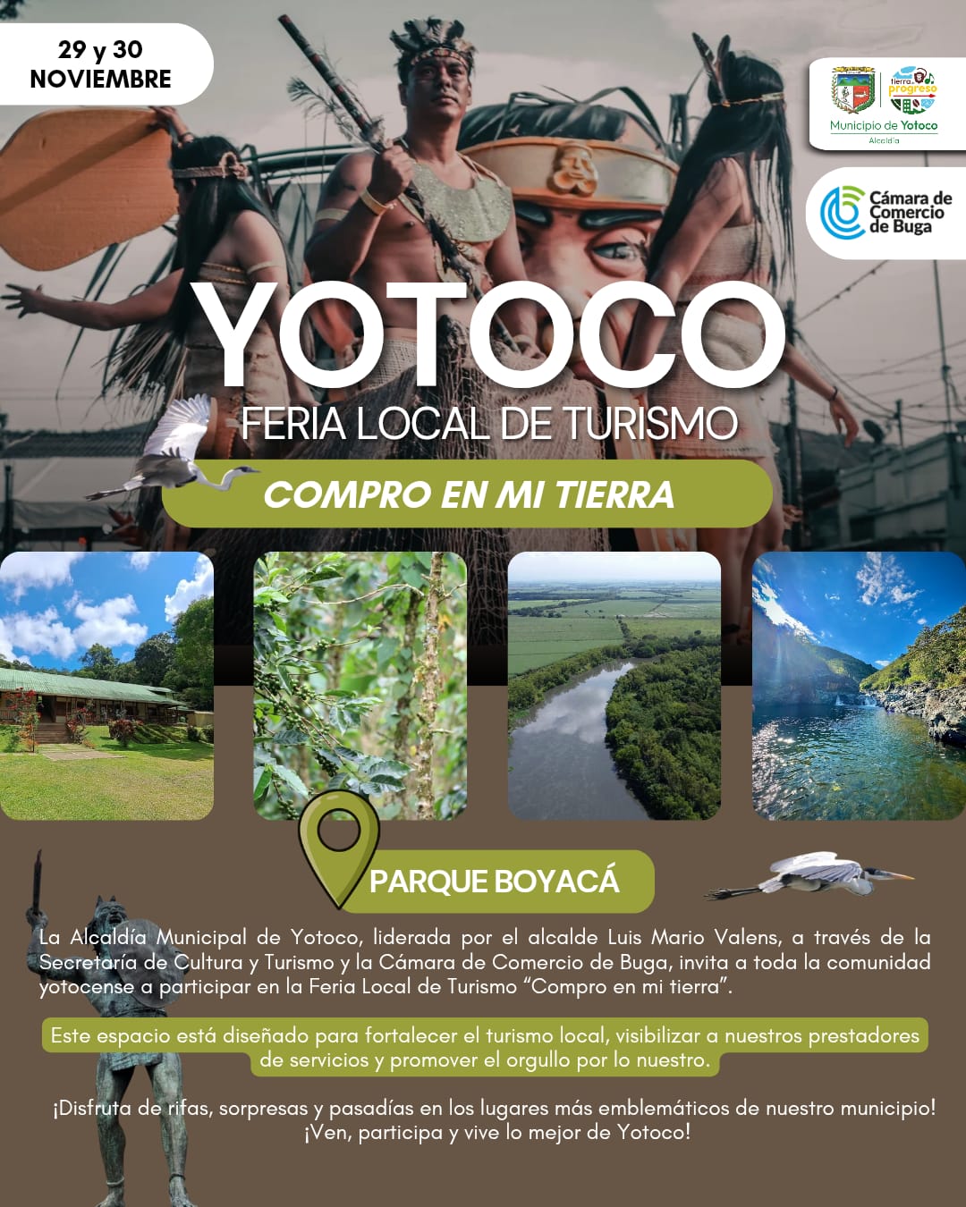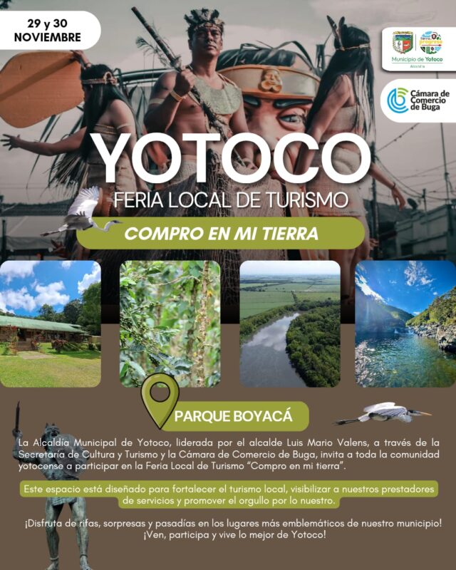 La feria reúne a prestadores de servicios turísticos, emprendedores, artesanos y representantes del sector gastronómico, quienes tendrán la oportunidad de exhibir sus productos y mostrar a la comunidad la diversidad de experiencias que ofrece Yotoco. Además, el evento busca impulsar el conocimiento de lugares emblemáticos, rutas ecológicas, actividades culturales y propuestas que fortalecen la oferta turística local.