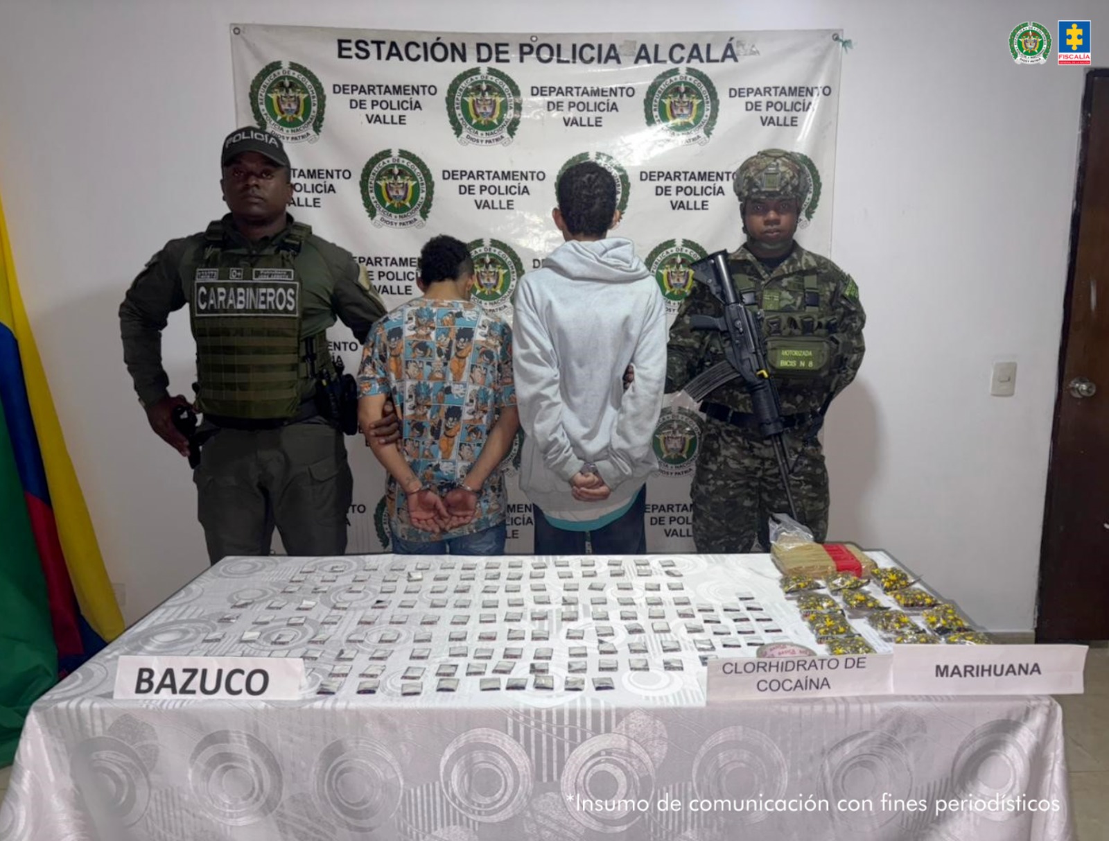 En Alcalá, fueron presentados ante un juez con función de control de garantías Jachson Andrés Gutiérrez Castaño y Carlos Andrés Valencia Torres. Según las autoridades, ambos hombres fueron sorprendidos en flagrancia con 147 bolsas que contenían cocaína y marihuana.