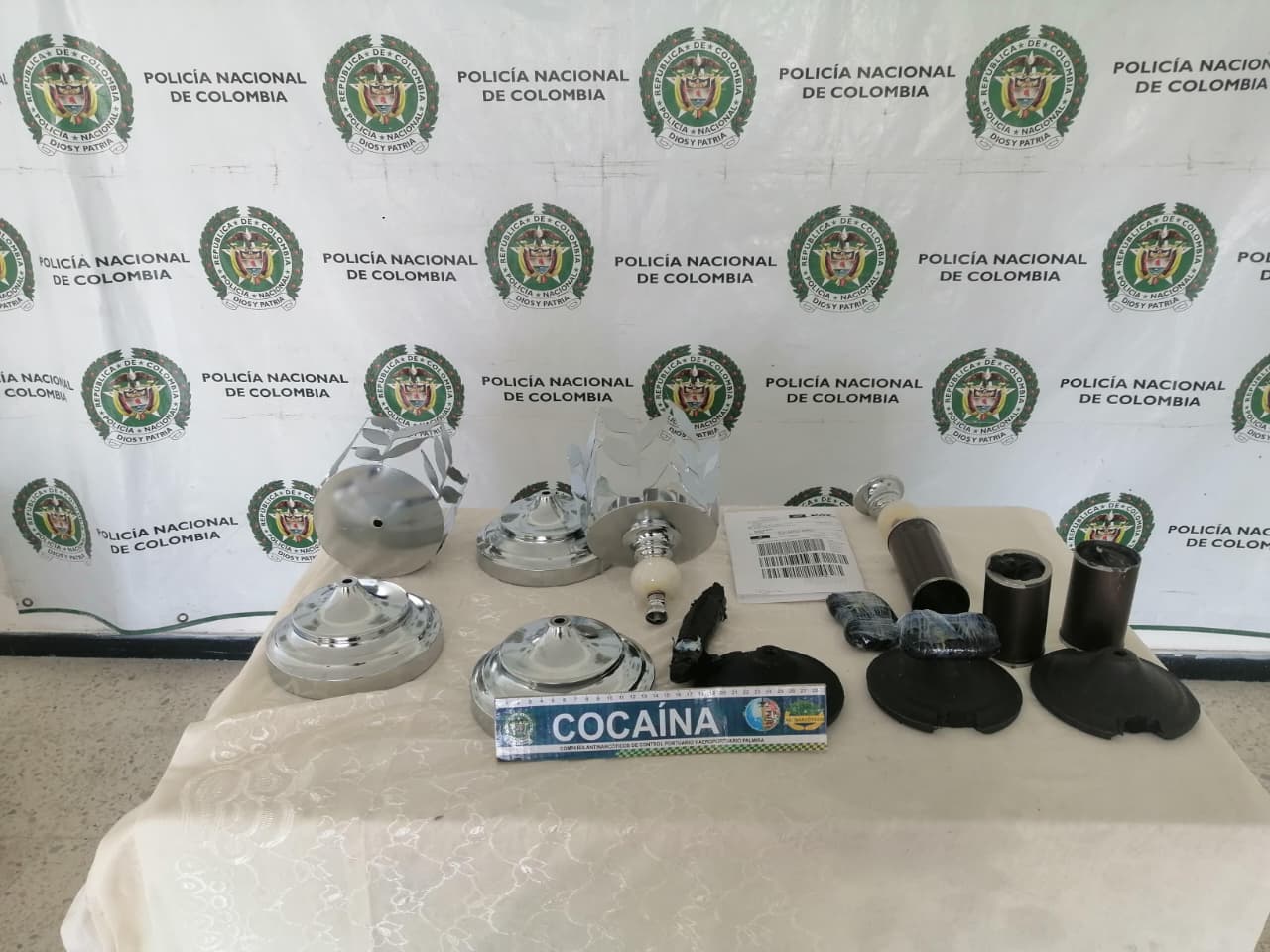 El procedimiento se desarrolló en la zona de carga del aeropuerto, donde uniformados adelantan controles rigurosos a mercancías y paquetes que son transportados al exterior. Durante estas verificaciones, los funcionarios identificaron tres lámparas que generaron sospecha por su peso y características irregulares. Al inspeccionarlas de manera minuciosa, se hallaron en su interior varios paquetes plastificados que contenían una sustancia blanca compatible con clorhidrato de cocaína.