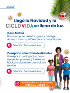 Con el mensaje “Llegó la Navidad y la Ciclovida se llena de luz”, esta edición busca que niños, jóvenes y adultos encuentren en cada caminata, pedaleada o pausa activa una oportunidad para fortalecer la unión familiar y promover hábitos saludables. Durante la jornada se contará con la estación Casa Matria en la Panamericana, donde se brindará orientación e información para la comunidad. También habrá una campaña educativa sobre diabetes, enfocada en prevención, autocuidado y hábitos de vida saludable.