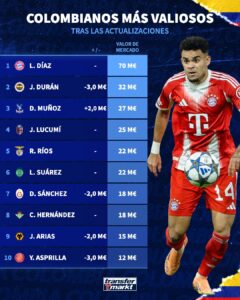 El extremo guajiro encabeza el listado con un valor de 70 millones de euros, cifra que lo posiciona no solo como el jugador colombiano más costoso, sino también como uno de los sudamericanos mejor valorados. Su impacto en el Bayern Múnich y su regularidad con la Selección Colombia han sido claves para mantenerse en la cima.