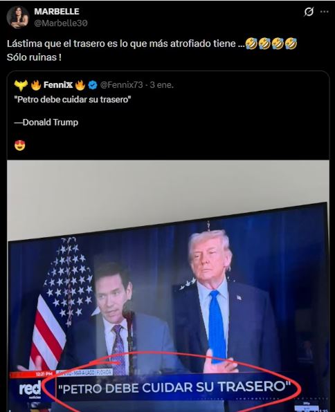 Marbelle no tardó en reaccionar a través de su cuenta en la red social X. La intérprete compartió una imagen del discurso de Trump y añadió un comentario sarcástico: “Lástima que el trasero es lo que más atrofiado tiene… Solo ruinas”.