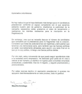 El empresario y exalcalde de Cali, Maurice Armitage, anunció que decidió declinar su aspiración presidencial, decisión que dio a conocer a través de una carta dirigida a los colombianos en la que explicó las razones que lo llevaron a retirarse de la contienda electoral.