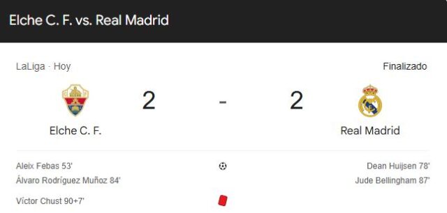 Elche abrió el marcador al minuto 52 con una jugada de gran elaboración: Germán Valera asistió de tacón a Aleix Febas, quien definió con sutileza ante la salida de Thibaut Courtois. Aunque el Madrid generó varias opciones en la primera parte con remates de Arda Güler y acciones de Mbappé, fue en el minuto 77 cuando Dean Huijsen igualó el marcador tras un tiro de esquina.