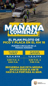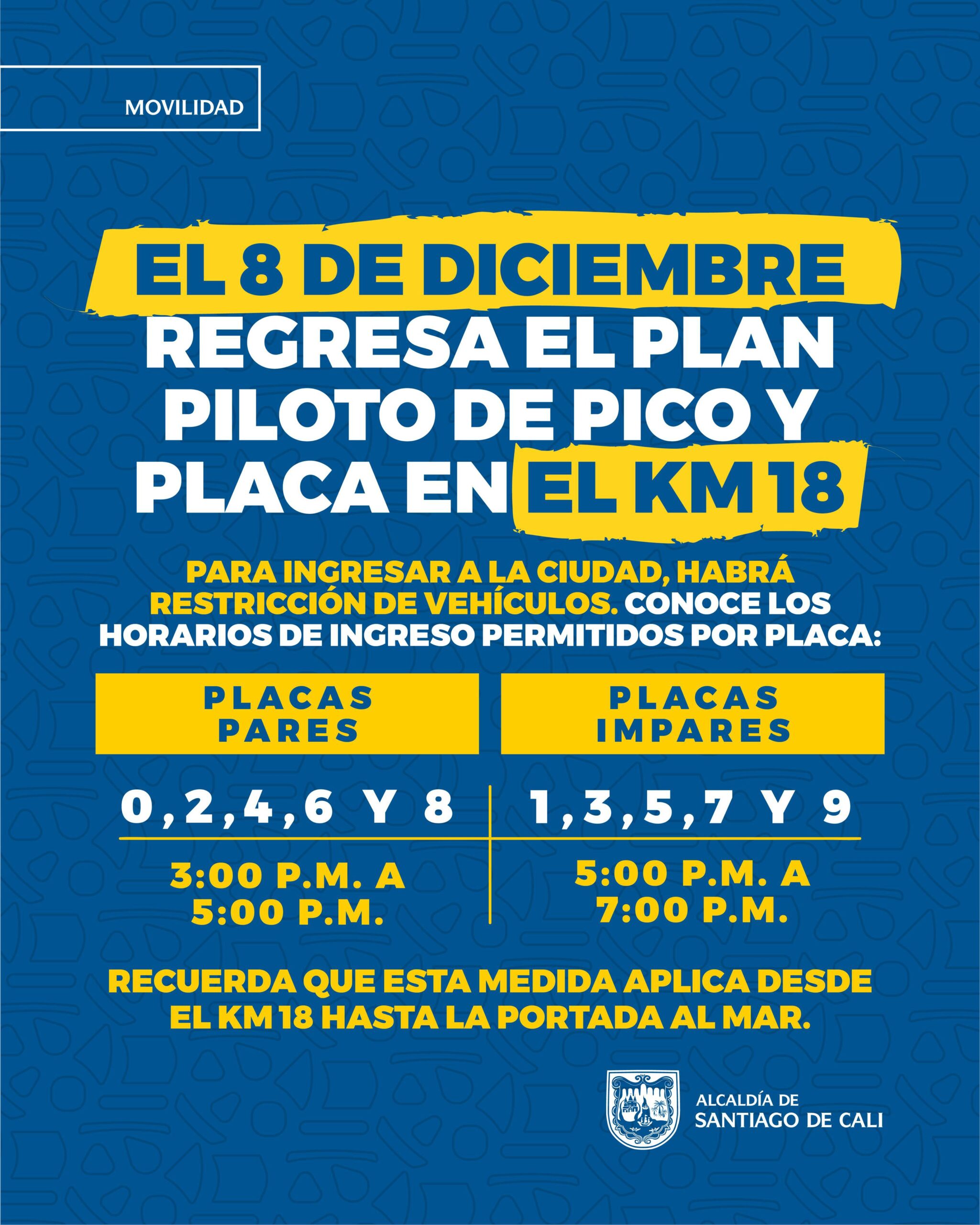 La secretaria de movilidad de Cali informa a la ciudadanía caleña que este lunes festivo 8 de diciembre vuelve el plan piloto de Pico y Placa en el #km18 para ingresar a la ciudad. La medida aplica desde el kilómetro 18 hasta la portada al Mar. El horario será desde las 3 a 5 PM. Para placas pares 0,2,4,6 y 8. Placas impares 1,3,5,7 y 9 de 5 a 7 PM